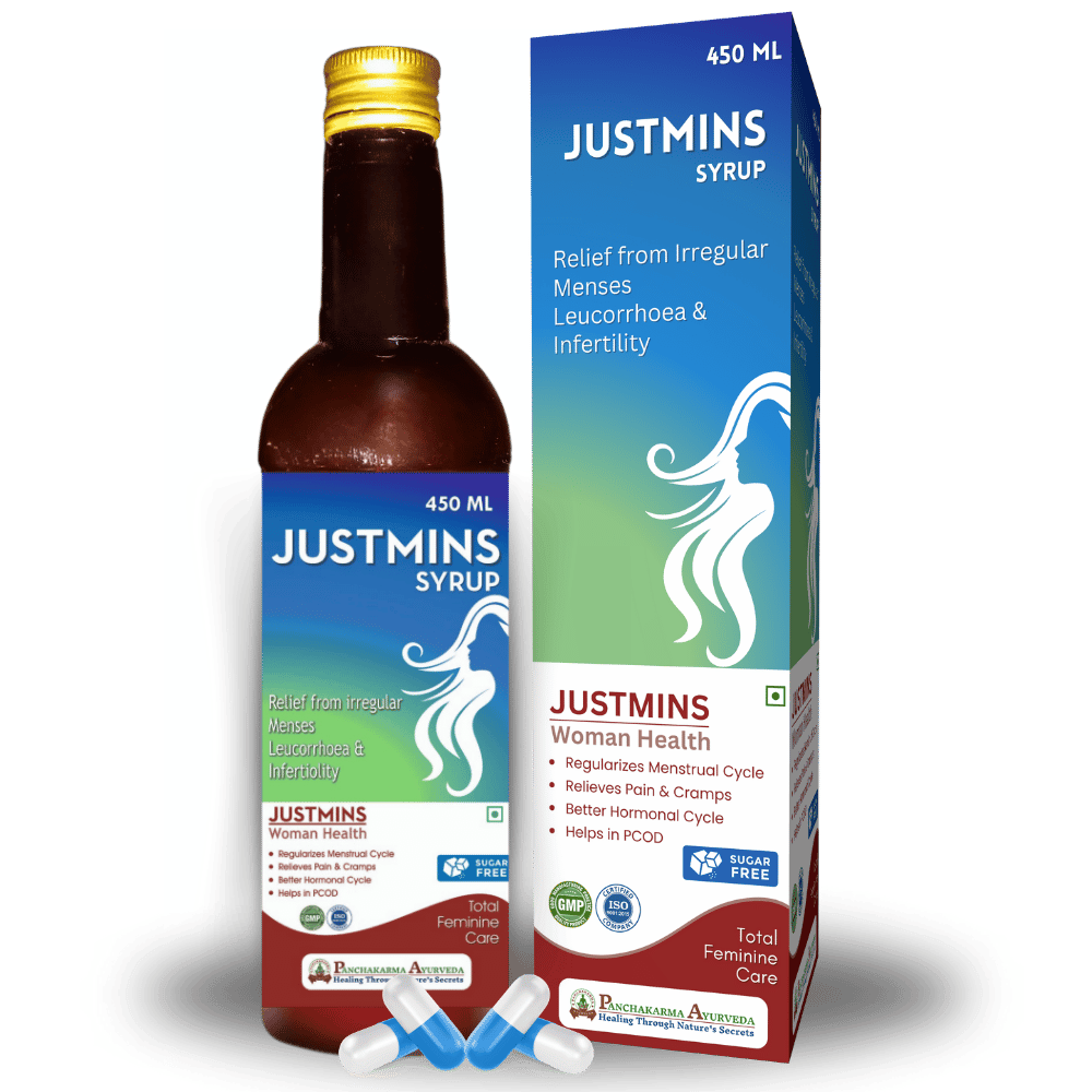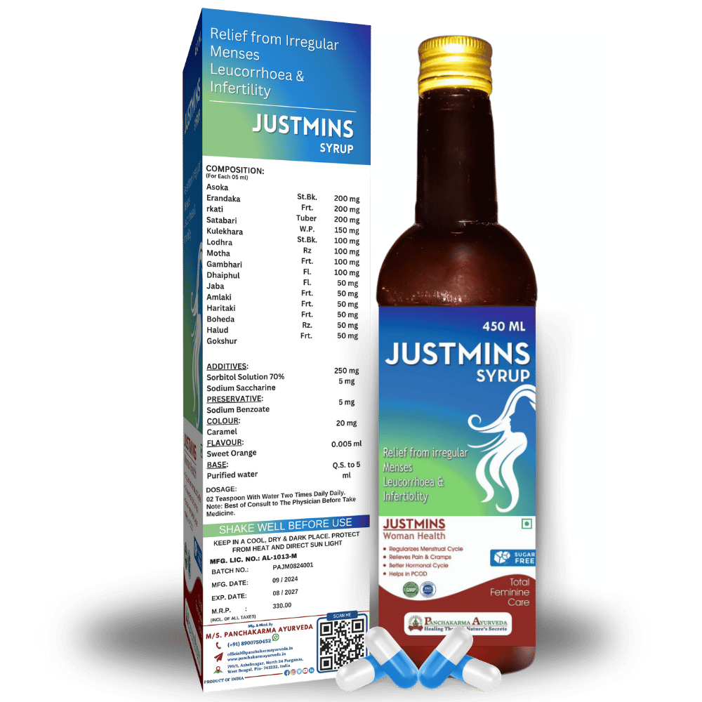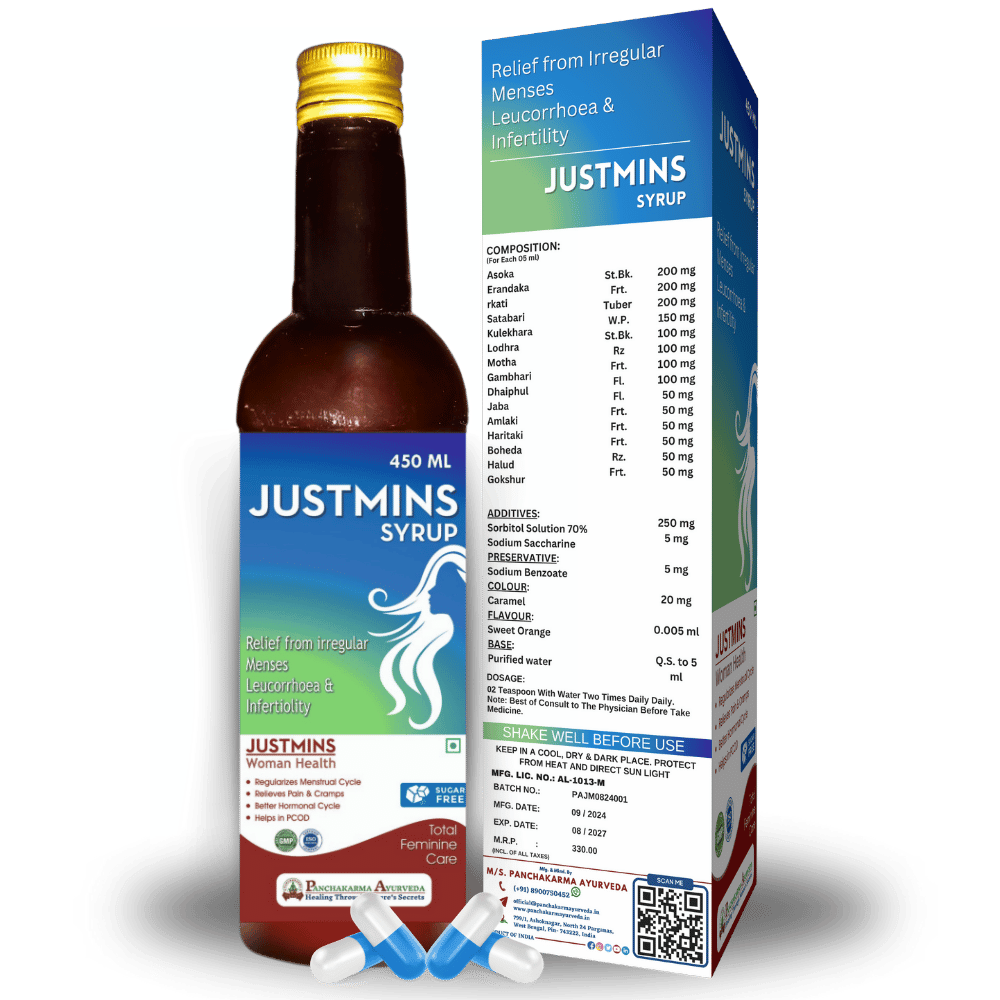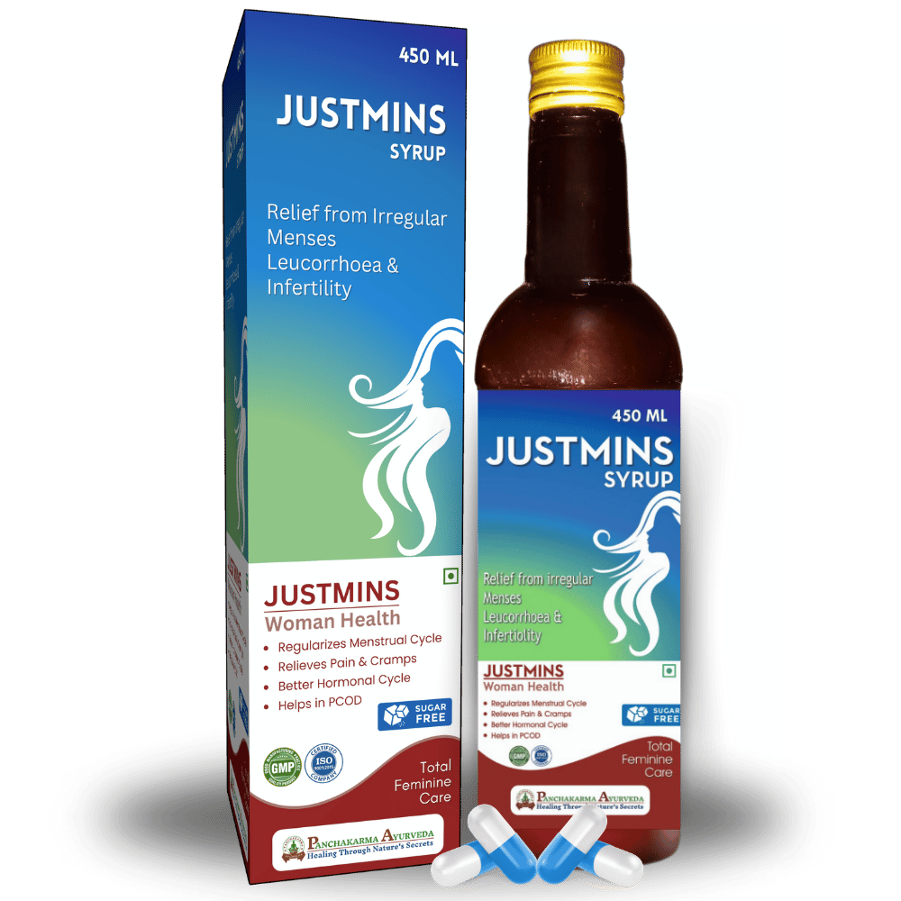 JustMins Syrup (450 ml) with 20 Free Capsules – Ayurvedic Solution for Irregular Menses, Leucorrhea, Gyno Problems & Infertility